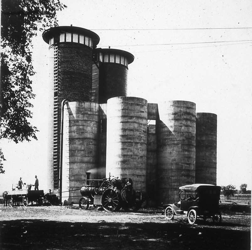 This September 1919 photograph of filling a silo with ear corn includes a wagon, a steam engine and an automobile as farm mechanization changed the Illinois agricultural scene.
