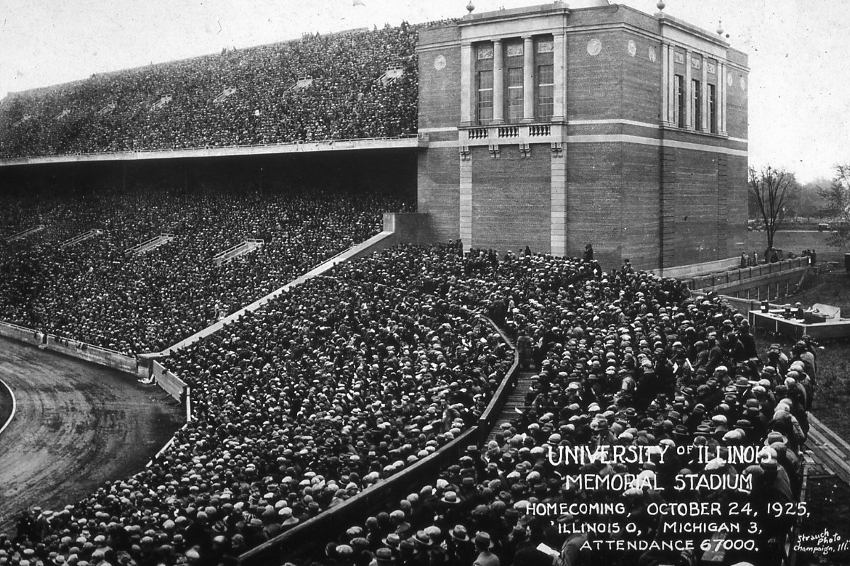 Dedicated in 1924, "Red" Grange led the Illini to a 39 to 14 victory over the Michigan Wolverines. When 67,886 fans returned in 1925, Michigan returned the favor with a 30 win over Illinois and "Red" Grange.