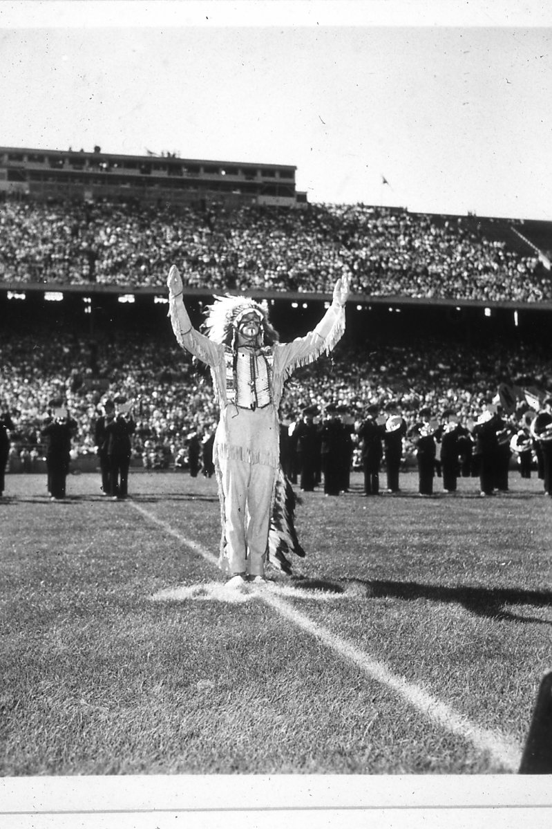 In 1926, Chief Illiniwek began a tradition of appearances at athletic contests. The 1952 Chief leads the singing of the "Alma Mater" at halftime.