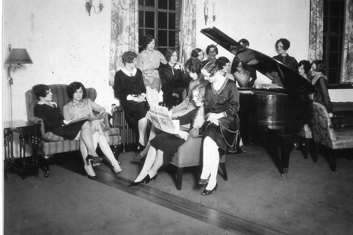 Sorority life in the 1930s centered around a grand piano in the 1ounge.