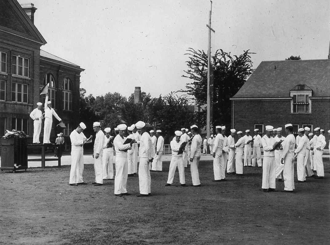 With the outbreak of World War II, the university again began wartime training programs. Here Navy students study semaphore signals.