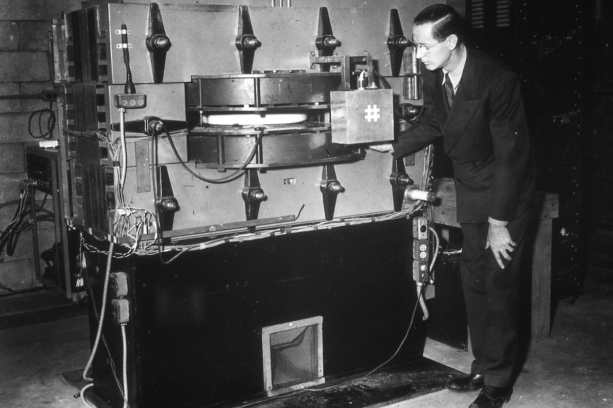 The end of World War II was marked with a public demonstration of the power of nuclear energy. At Illinois, Physics Professor Donald Kerst and associates resumed work on the Betatron, which had been developed here in 1941. This 1952 photograph shows Kerst with the 22 MEV model.