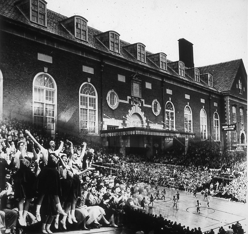 The "March madness" of the state high school basketball tournament is represented in this composite photograph of Huff Gymnasium, site of the tournament from 1926 to 1962.